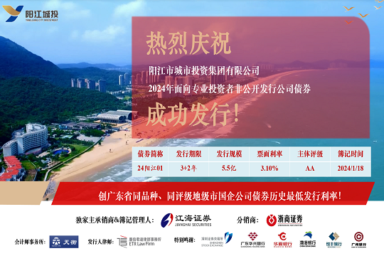2024年1月19日,市城投集團在深圳證券交易所成功發(fā)行“陽江市城市投資集團有限公司2024年面向專業(yè)投資者非公開發(fā)行公司債券”。本期債券發(fā)行規(guī)模為5.5億元,期限為5(3+2)年,票面利率3.10%,全場認購倍數(shù)超過4.8倍,是...