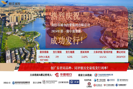 2024年9月26日,市城投集團在中國銀行間交易商協(xié)會成功發(fā)行“陽江市城市投資集團有限公司2024年第一期中期票據(jù)”。本期債券發(fā)行規(guī)模為6.3億元,期限為3年,票面利率2.43%,全場倍數(shù)超過2.52倍。本期債券創(chuàng)下了廣東省同...