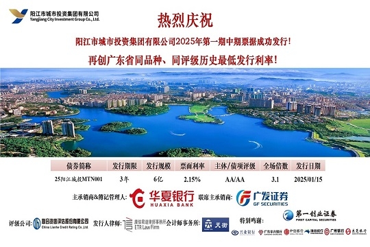 2025年1月15日,市城投集團在中國銀行間交易商協(xié)會成功發(fā)行“陽江市城市投資集團有限公司2025年第一期中期票據(jù)”。本期債券發(fā)行規(guī)模為6億元,期限為3年,票面利率2.15%,全場倍數(shù)超過3.1倍,合計申購機構數(shù)23家。本期債...